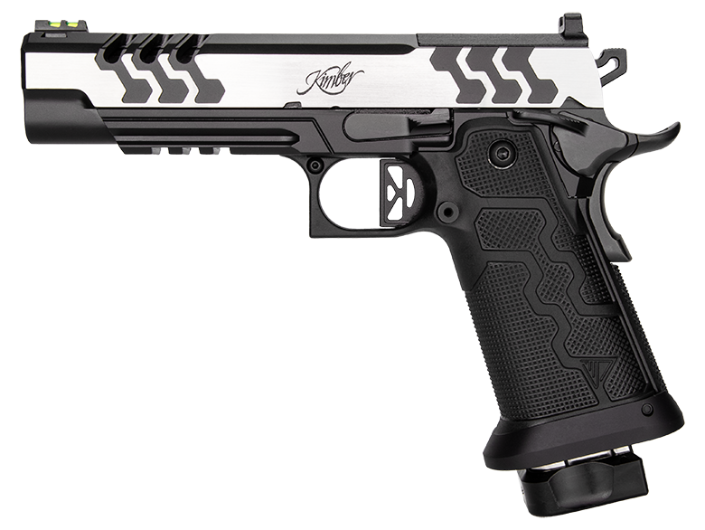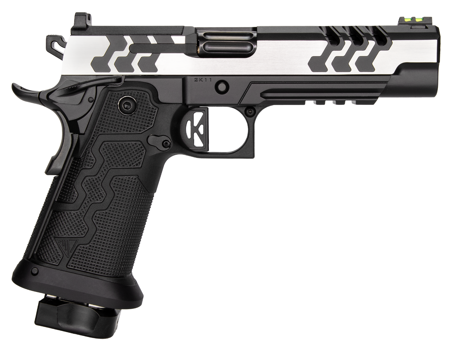 Kimber has reached the summit of high capacity 1911 design. The 2K11 is the most capable, out-of-the-box, high-capacity 1911 variant available. From hammer to muzzle, the 2K11 has been built around all the features Kimber enthusiasts requested. The anchor to this performance starts with an enhanced sub-frame shaped for superior magazine fit and control. It comes standard with an accessory rail for optional lights and lasers. The slide is made of stainless steel and features an external extractor for incredible reliability—a ramped barrel aids in consistent feeding. The new MJD Designs Kevlar® and carbon fiber grip deliver superior strength and echo the slide serrations found on this model. This combines to make the 2K11 a masterpiece of modern firearms design from Kimber.