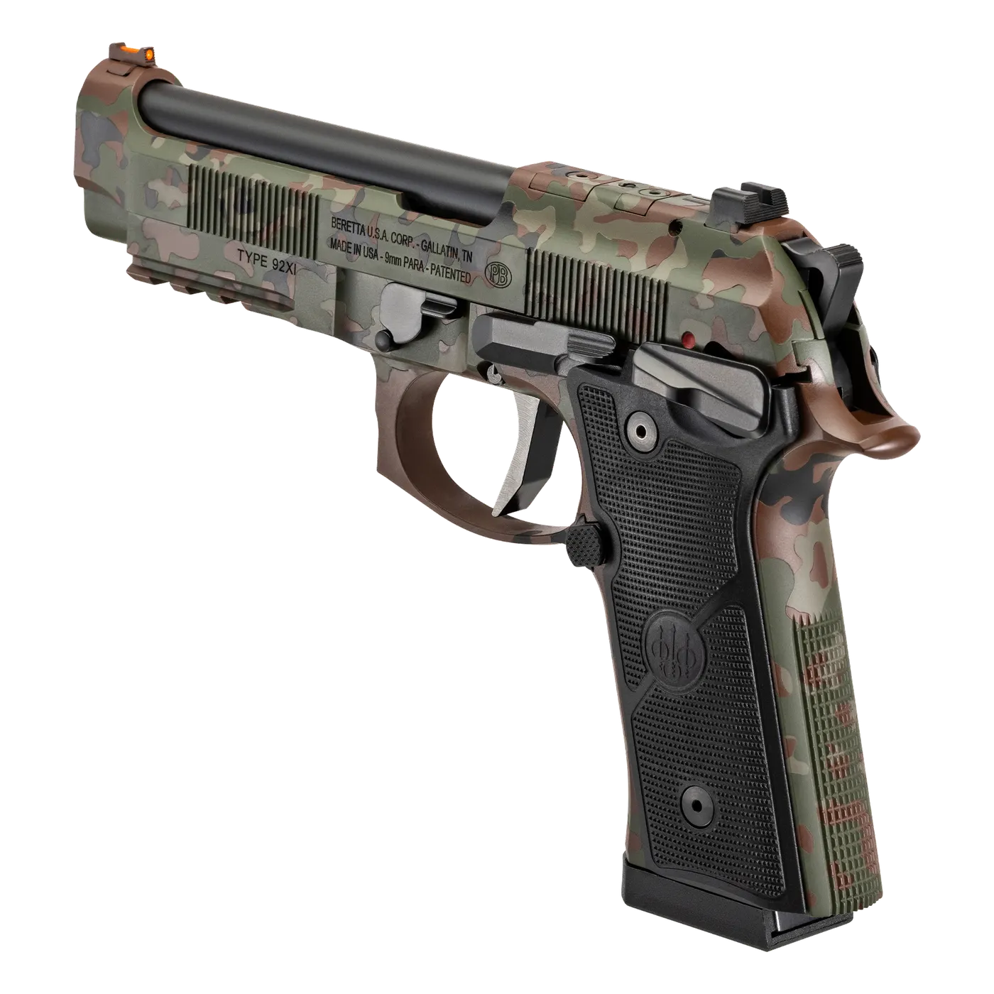 The 92XI Combat series features the 92XI Single-Action Only (SAO) pistols. The 92XI brings the long-awaited frame-mounted safety to the standard 92 family of products, as well as a single action-only variant and various ergonomic enhancements. The frame-mounted safety offers an ambidextrous solution, bringing the safety lever more in reach with natural ergonomics. The 92XI features the X-treme-S single action only and flat-faced trigger, performance DLC coated trigger components, and a lightweight skeletonized hammer, allowing for a crisp trigger pull with the option to go cocked and locked. The 92XI carries forward the Vertec style frame, a fiber optic front sight for faster sight acquisition, and the option for MRDS optics mounting, making this a high-performing, reliable choice for personal defense and competition.