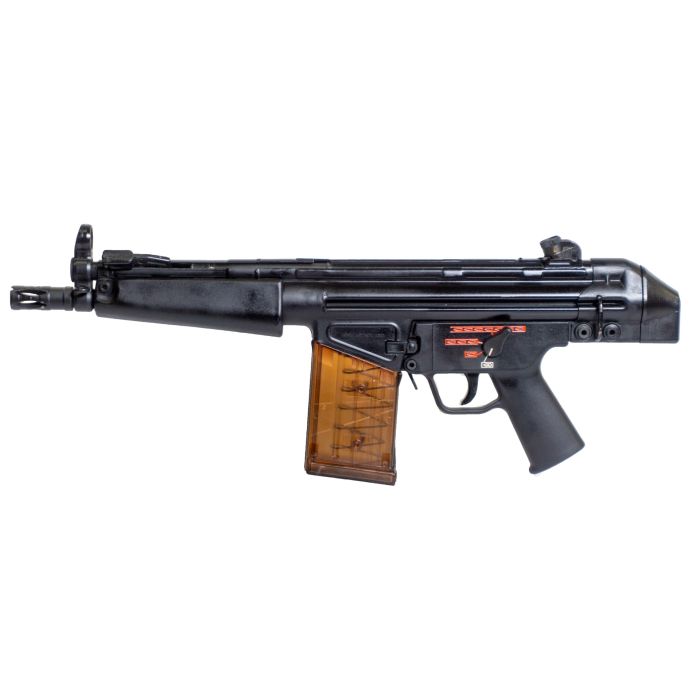 The Century Arms AP 51 is based on the iconic HK51 PDW and is chambered in 7.62x51mm, with a 20 round G3 Patterned Polymer magazine, an overall length of 23.3 inches, a width of 2.2 inches, a height of 8.5 inches, a cold hammer forged barrel length of 8.3 inches and an unloaded weight of 7.9lbs (3.6kg). The AP 51 is equipped with a Navy style assembly with an ambidextrous selector, MP5 compatible wide handguard, standard G3 trigger set-up and bird cage style flash hider.