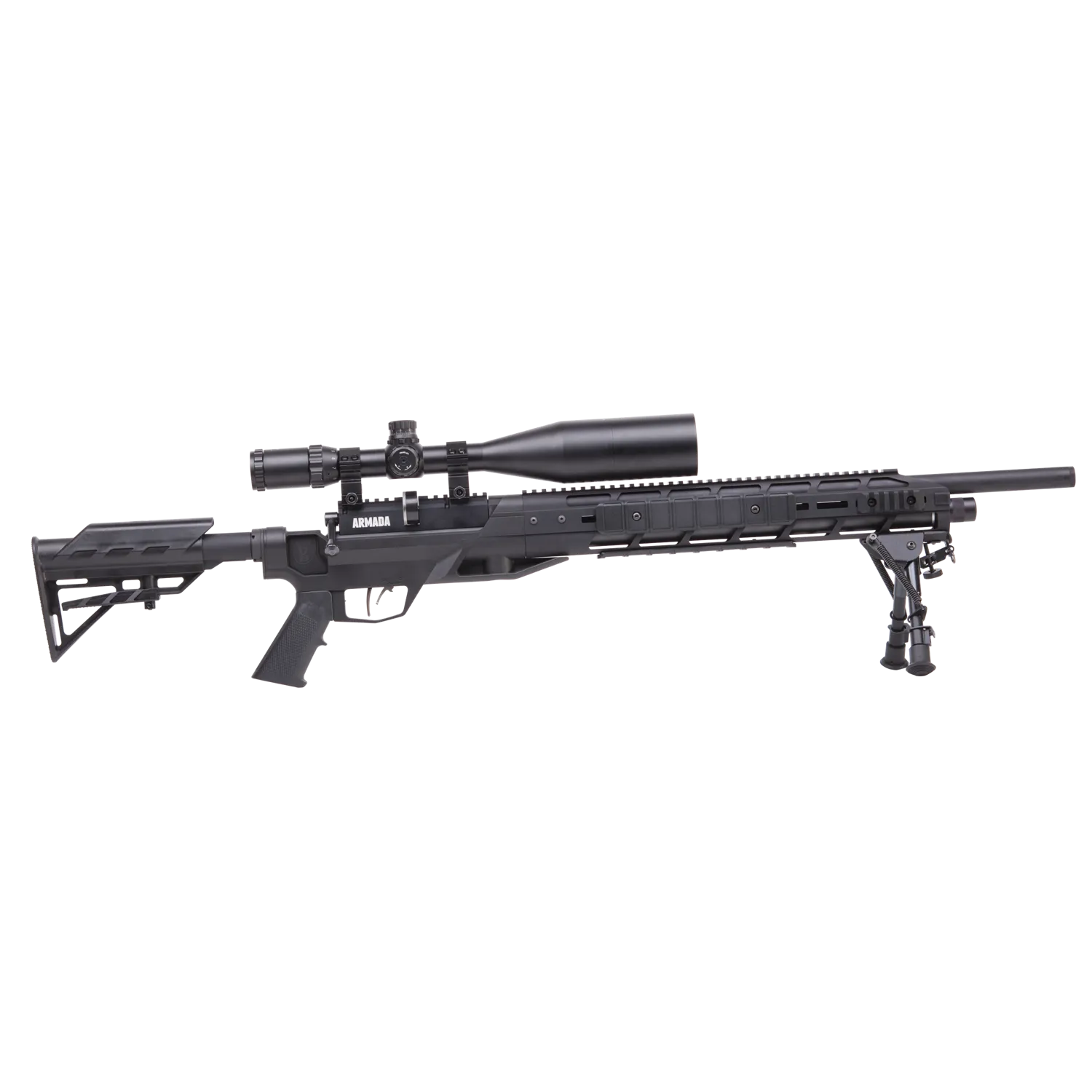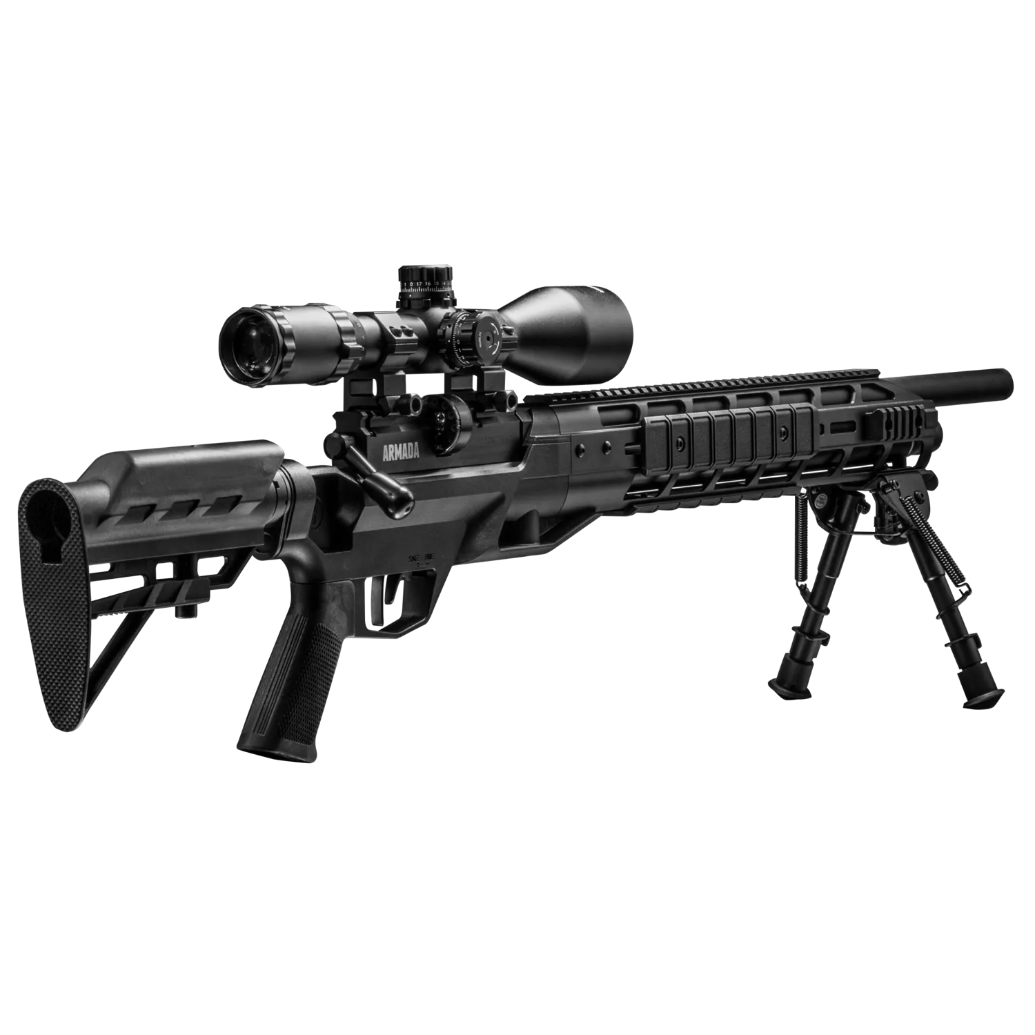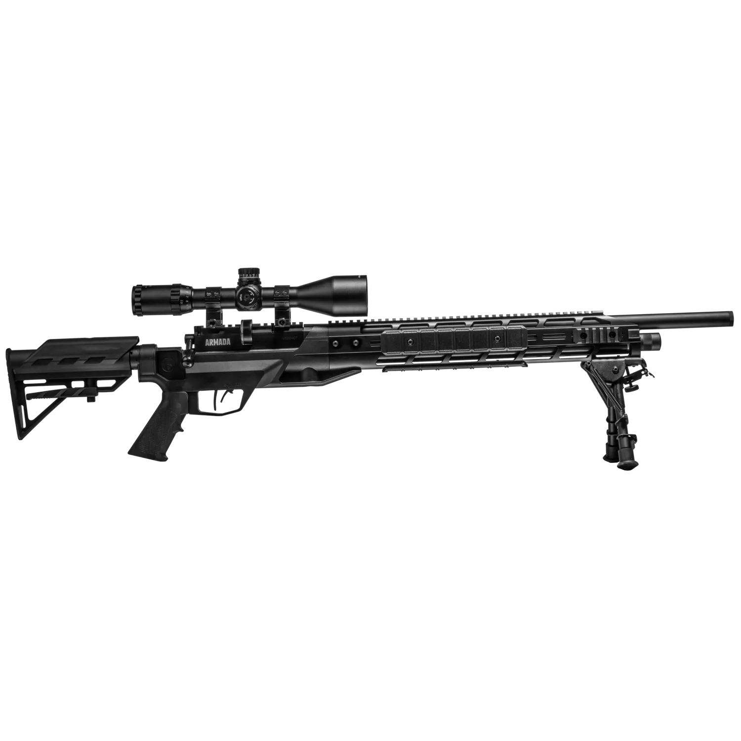 The Benjamin Armada is capable of delivering velocities of 1100 fps (.177), 1000 fps (.22), and 900 fps (.25), making it an outstanding choice for small game hunting, plinking, and target shooting. The Armada air rifle gets more than 30 shots per fill, and it features a 10-shot magazine and full suppression. The machined Picatinny rail fits your go-to accessories, so you can customize your Benjamin with ease. The crisp, two-stage trigger feels superb, and the Benjamin Armada features an onboard gauge for monitoring air pressure. With a 4-16×50 scope and bipod included, this Benjamin Armada combo is a worthy addition to your collection and your legacy.