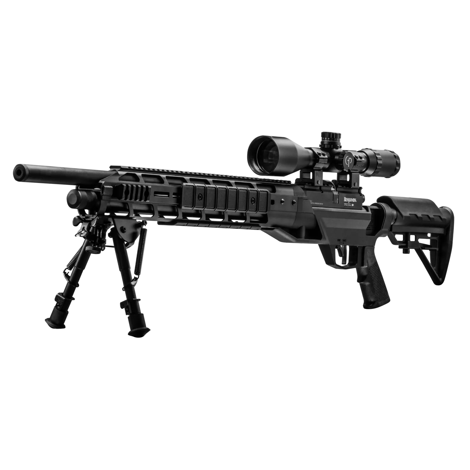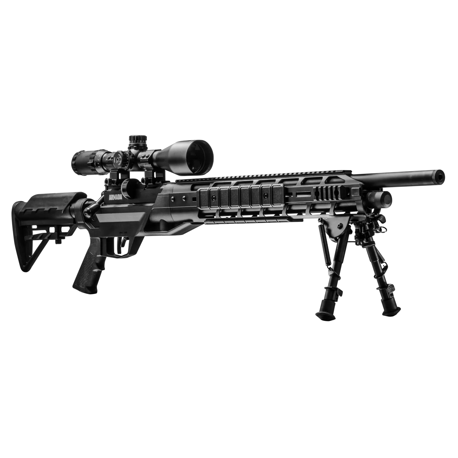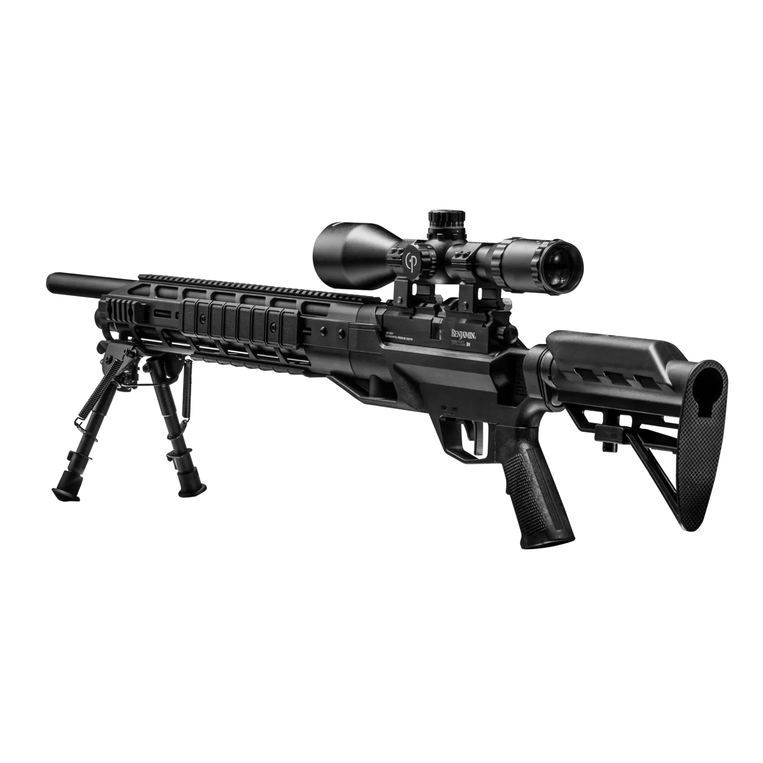 The Benjamin Armada is capable of delivering velocities of 1100 fps (.177), 1000 fps (.22), and 900 fps (.25), making it an outstanding choice for small game hunting, plinking, and target shooting. The Armada air rifle gets more than 30 shots per fill, and it features a 10-shot magazine and full suppression. The machined Picatinny rail fits your go-to accessories, so you can customize your Benjamin with ease. The crisp, two-stage trigger feels superb, and the Benjamin Armada features an onboard gauge for monitoring air pressure. With a 4-16×50 scope and bipod included, this Benjamin Armada combo is a worthy addition to your collection and your legacy.