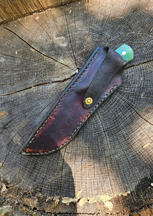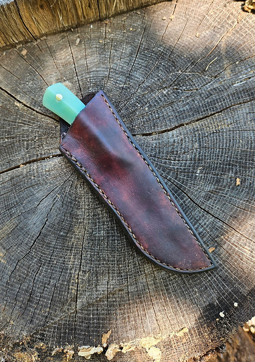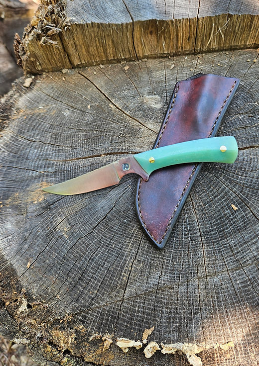Nice little hunting knife. Based off a bird and trout design. This 2 ⅞ inch blade has a super comfortable Jade colored G10 handle. 7 inches overall length. Comes with a hand sewn leather sheath