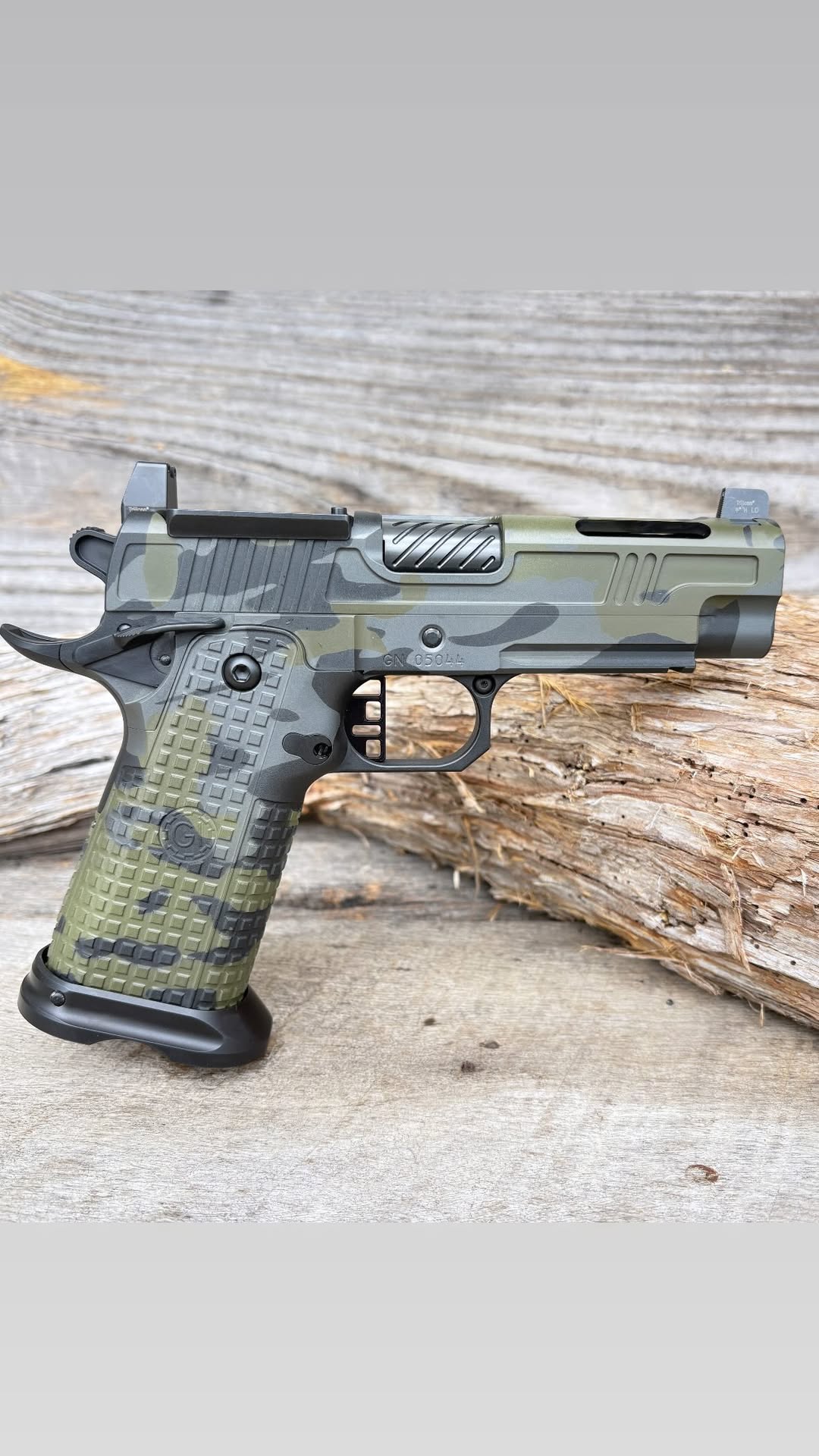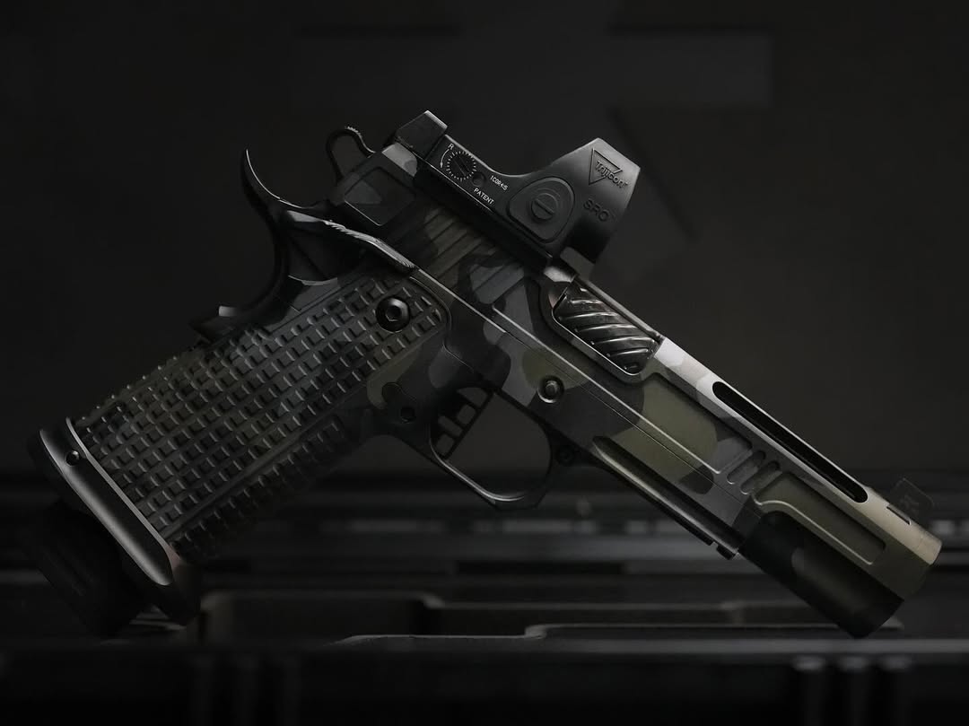 The commander customĀ is a no nonsense fighting pistol. Chambered in .45ACP or 9mm, and sporting a long list of standard features, The American is equally at home on duty, in service, or on your nightstand, the gun comes fully with the optics shown on the picture