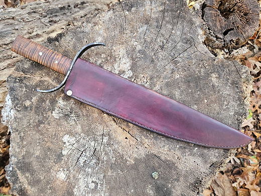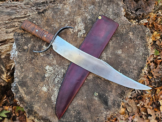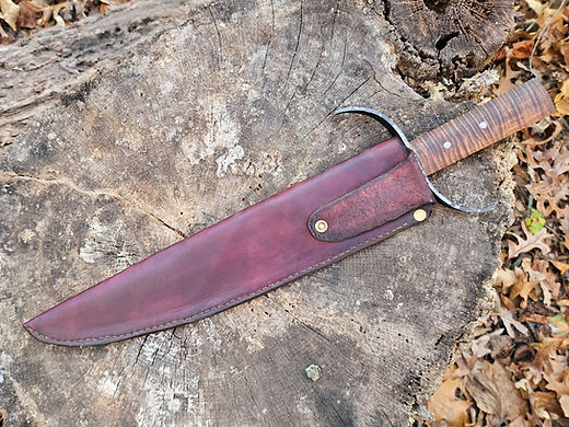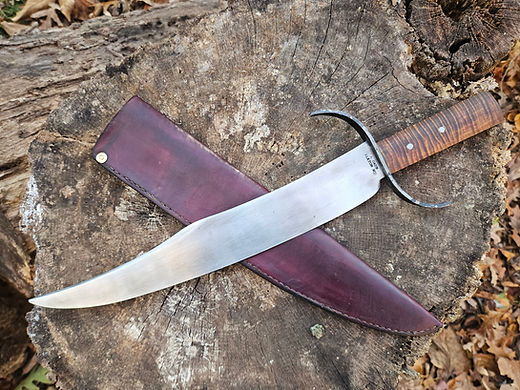 A beautiful upset clip point Lousianna bowie. Blade is a 12 ¼ inches made from high carbon 8670 steel. The cross gaurd is forged iron with a curly maple handle held in by 2 iron rivits. Overall it is 17 inches long. This blade isn’t heavy as i thought it would be. Beautifully balanced feel. It comes with a hand sewn leather sheath