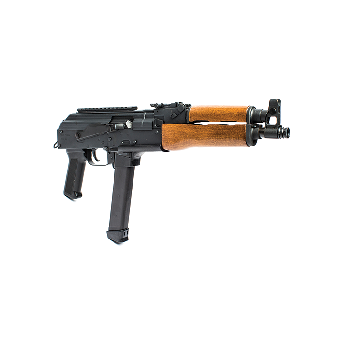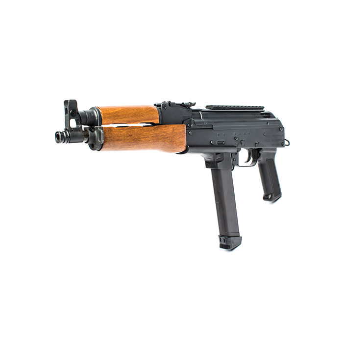 Built in Romania the DRACO NAK9 is chambered for 9mm Luger, features a Picatinny optics rail on the hinged dust cover, and includes a 33-round magazine. This firearm accepts Glock 17 and 19 style magazines, which allows for versatility. The NAK-9 comes with standard style AK Sights for full-size models, Threaded Barrel to attach your desired muzzle device, and Premium Wood Handguards