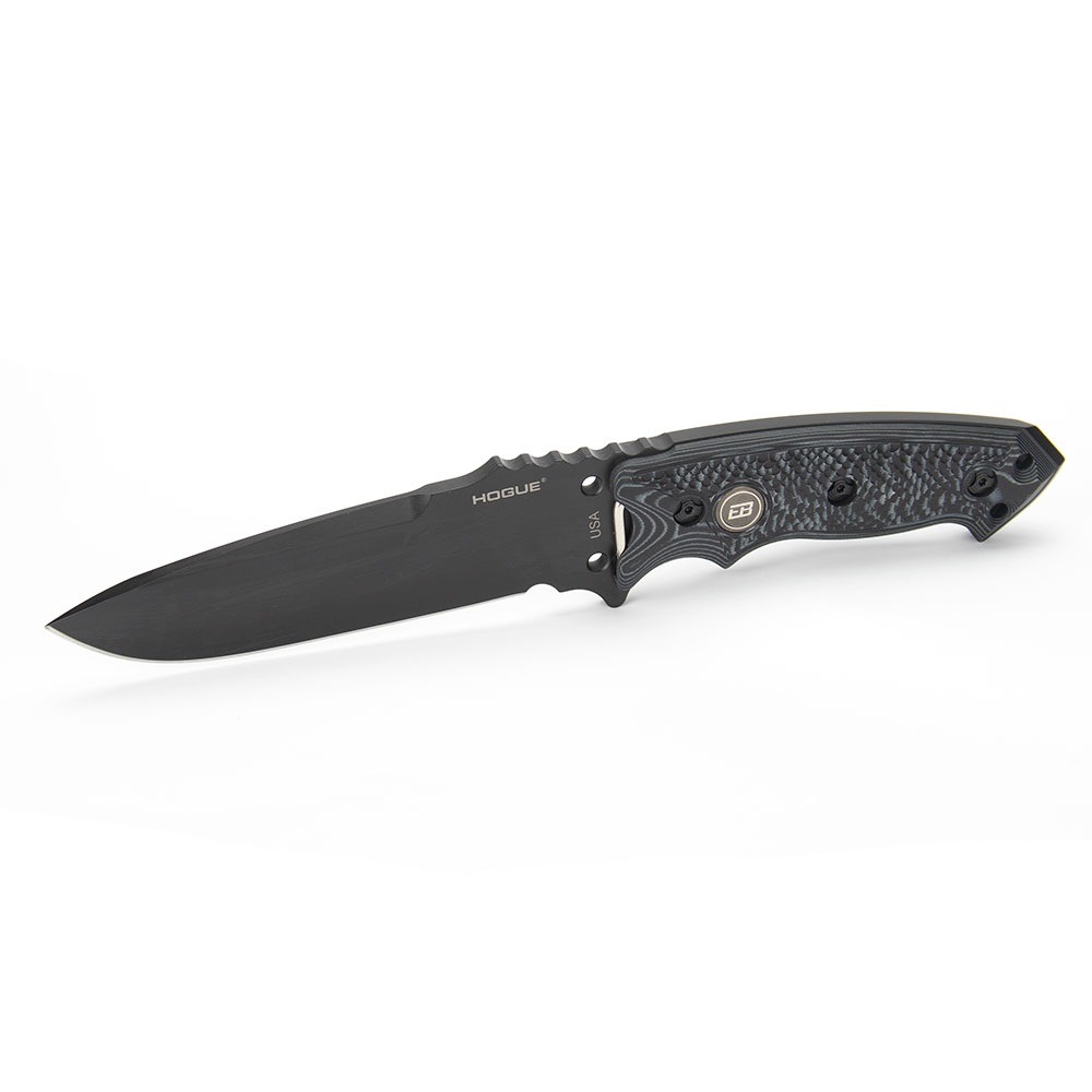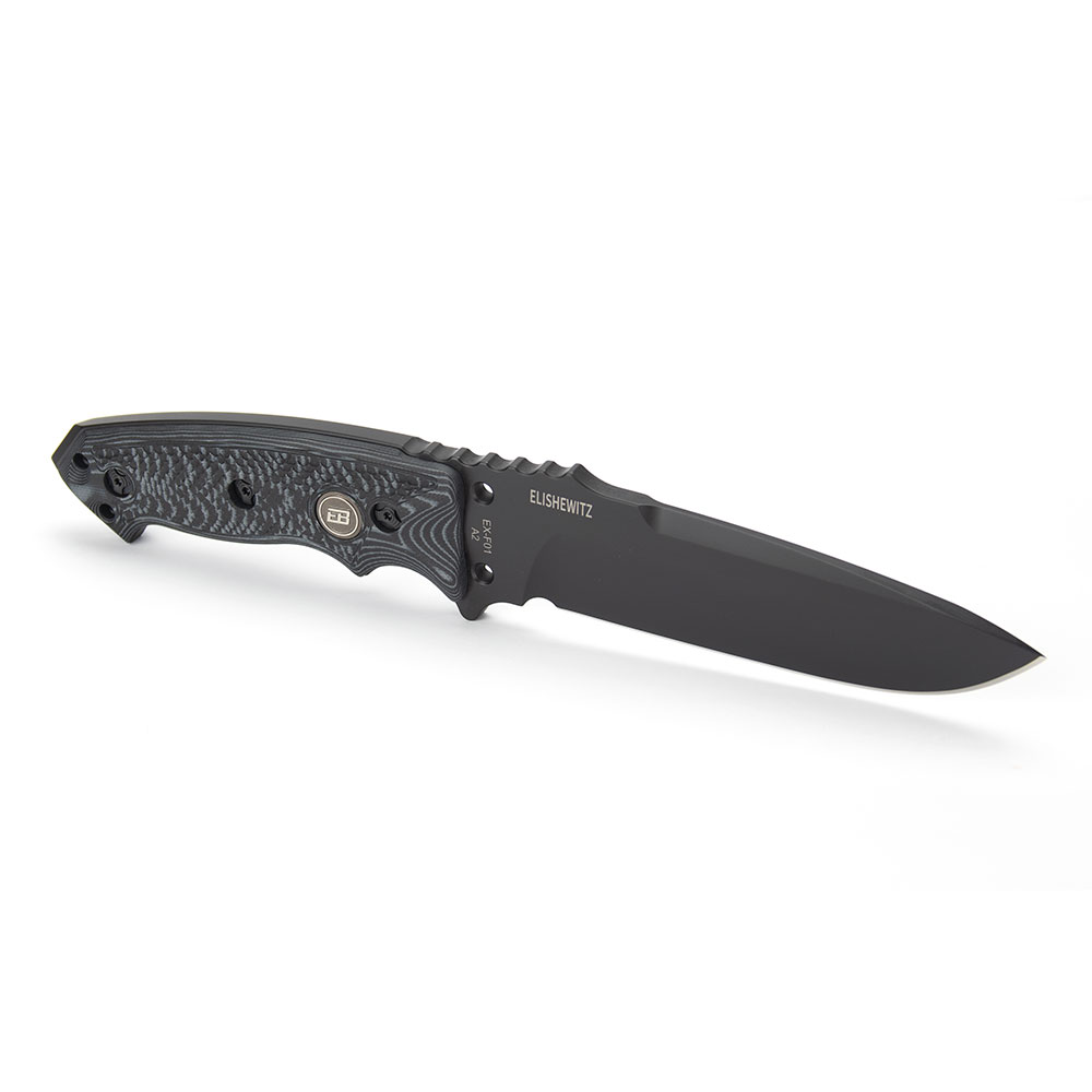 Our fixed blade is a 5.5” drop point blade from A2 tool steel making it a great working knife. It will hold an edge and be a perfect daily companion for any outdoor activity or as a daily carry if you prefer a fixed blade. The black Cerekote finished blade is complimented by the black G-Mascus Snakeskin scales with perfectly fitted EB medallion.