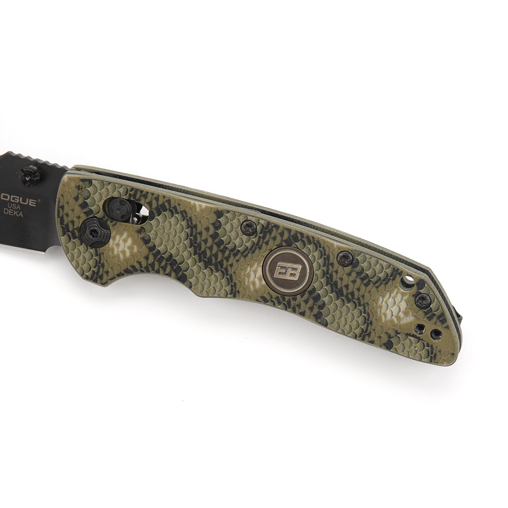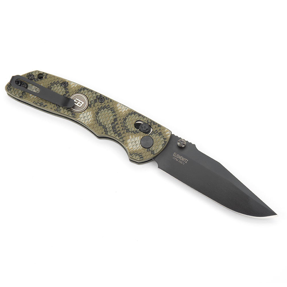 The Ed Brown ABLE Lock Folder has a clip point blade that is finished in black Cerakote with G-10 frame. The ABLE lock makes it not only smooth and easy to deploy but maintains a positive lock. Ed Brown’s signature Snakeskin on green G-Mascus that provides an attractive and positive grip ready for any task, the EB medallion is perfectly fitted into the scales. Reversible deep pocket clip allows for tip down carry and maximum concealability.