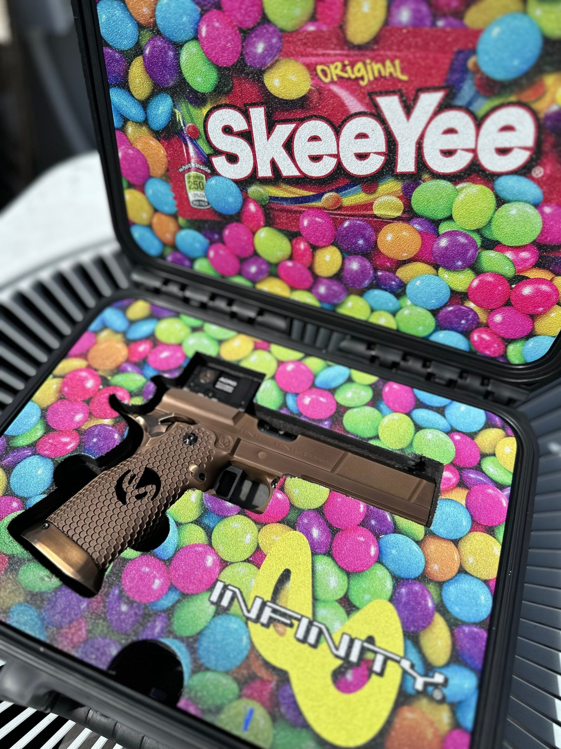 The Infinity Firearms (Strayer-Voigt) SkeeYee is a semi-automatic pistol chambered in 9mm Luger. It features a 5-inch barrel configured in the Sight Tracker style, designed to maintain consistent sight alignment through the firing cycle. The slide is cut for an Aimpoint Acro optic with a low mounting profile, allowing a co-witness setup with iron sights. The frame and slide exhibit Infinity’s precision-machined construction typical of their competition-grade pistols, finished to a high standard with clean lines and tight tolerances.