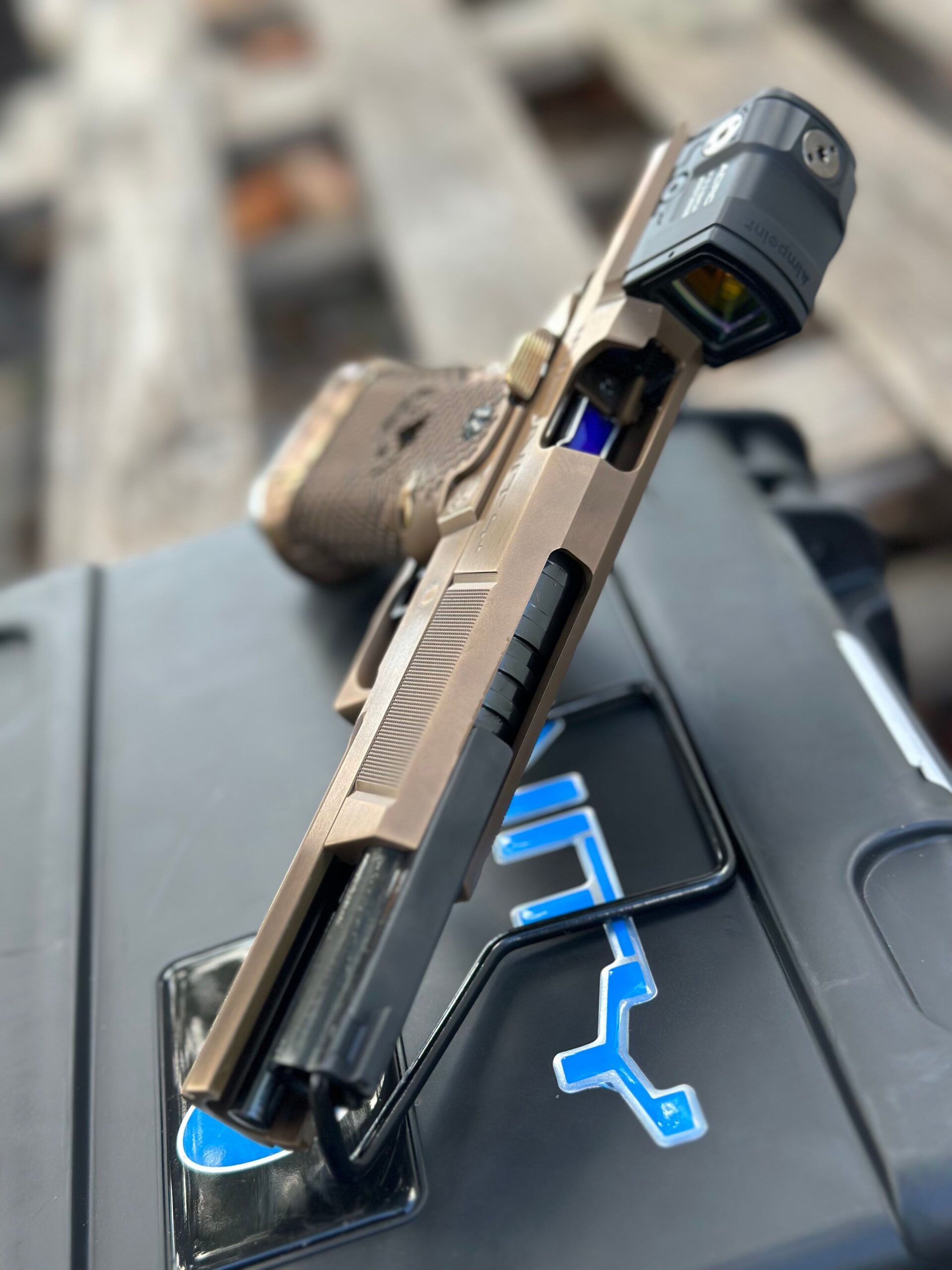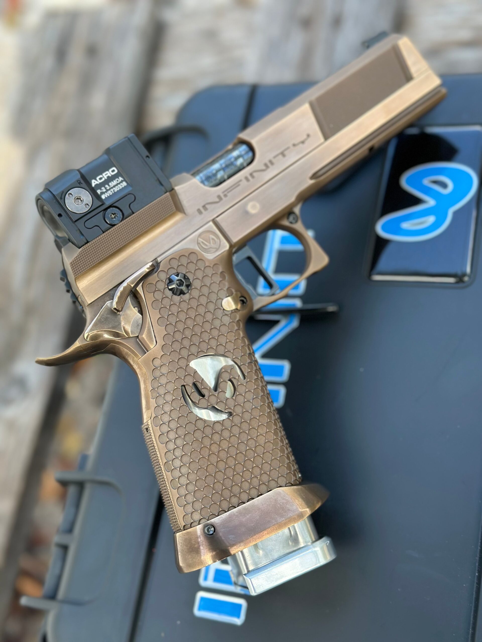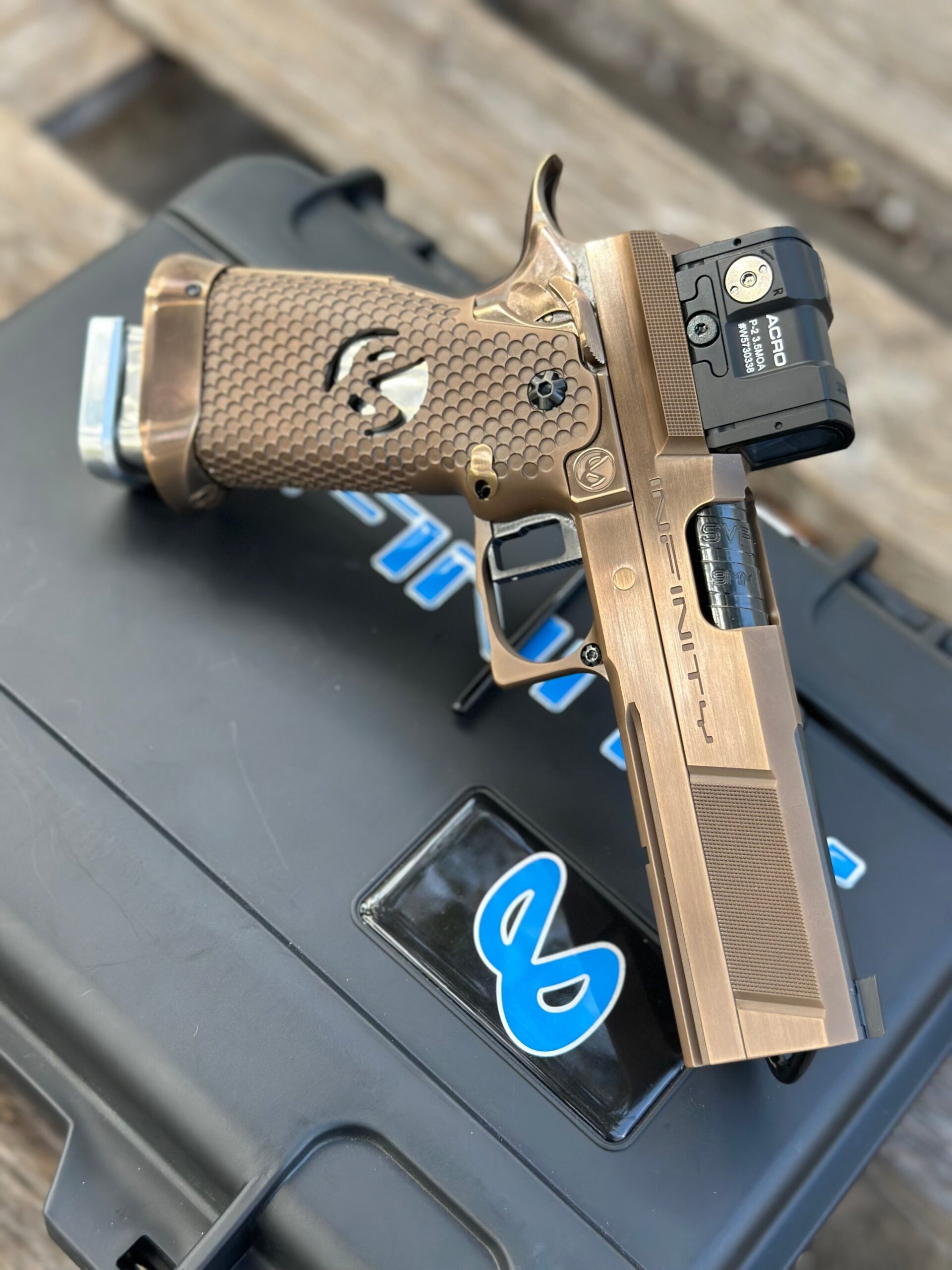 The pistol incorporates an extended 30 lines-per-inch checkering pattern on the front strap to enhance grip control. Infinity’s proprietary SVP hybrid barrel system is included, combining a sight-tracking top section with standard barrel geometry for balanced performance. The grip uses a micro pocket bronze design with a Mobius cutout, providing a distinctive appearance and tactile surface.