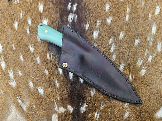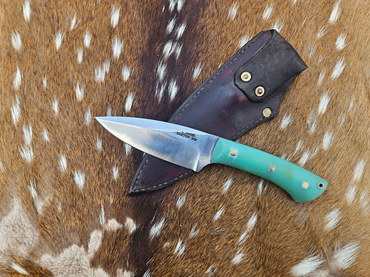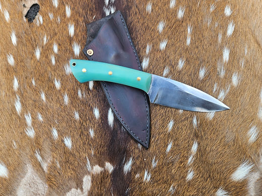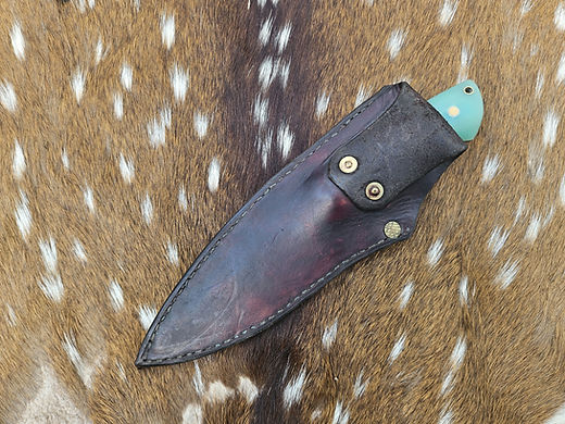 Steel is 8670. Handle material is Jade G10. Hand sewn leather sheath