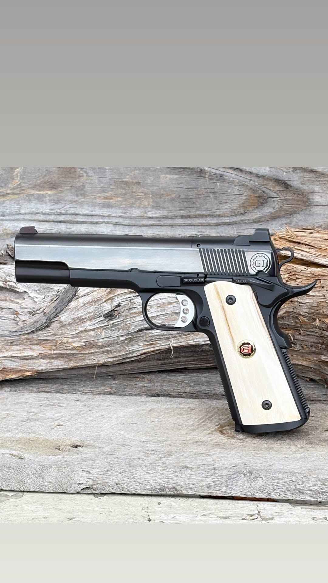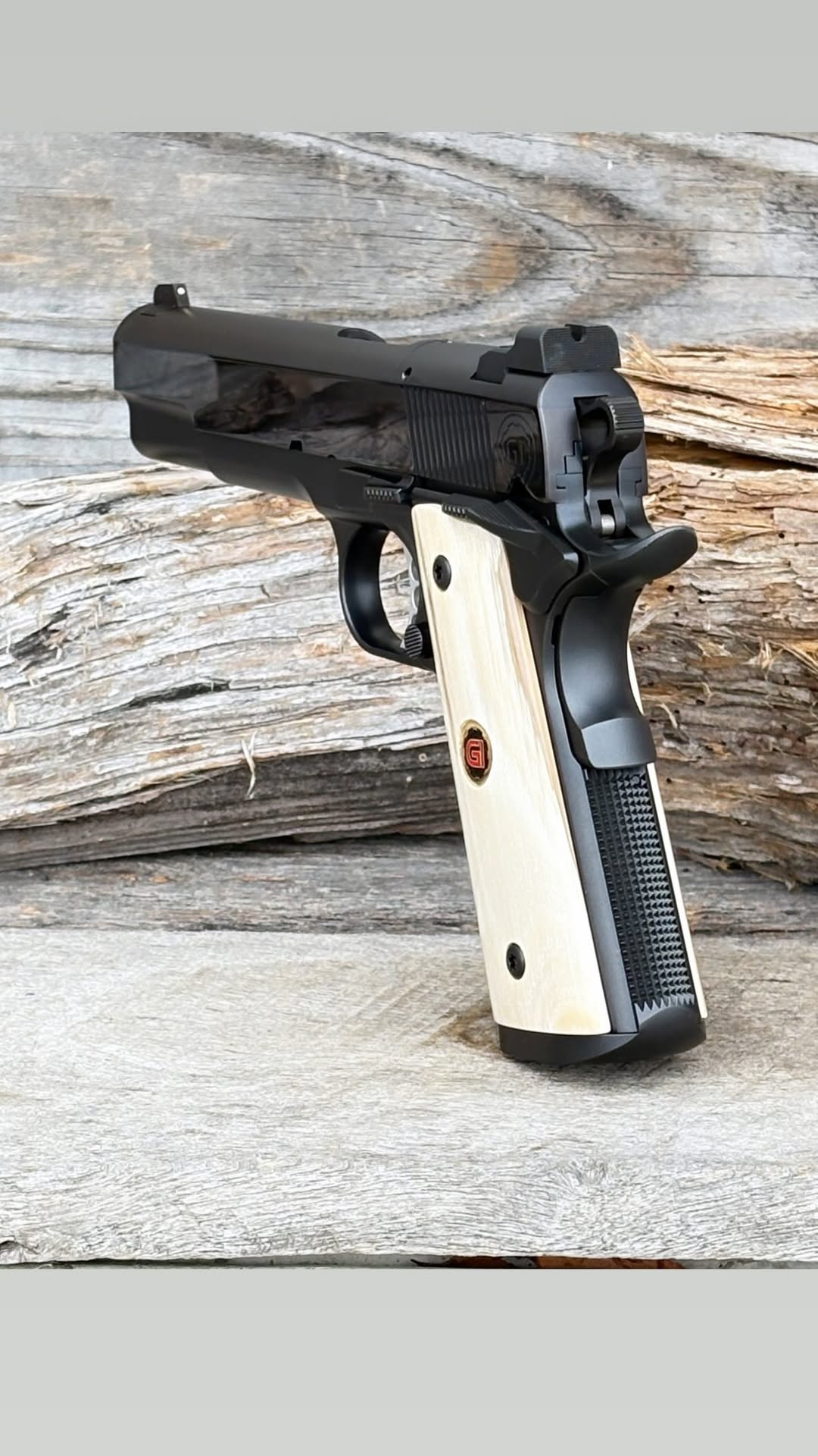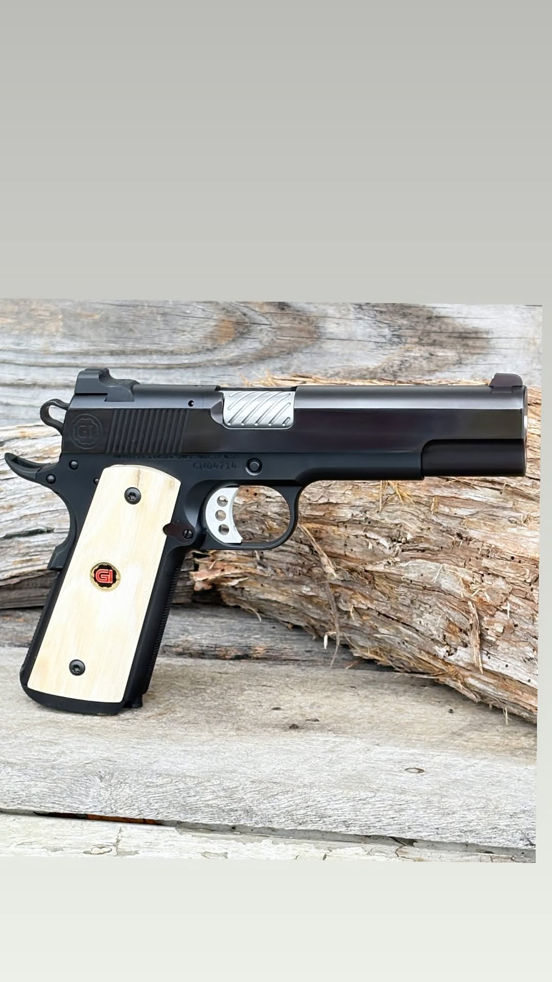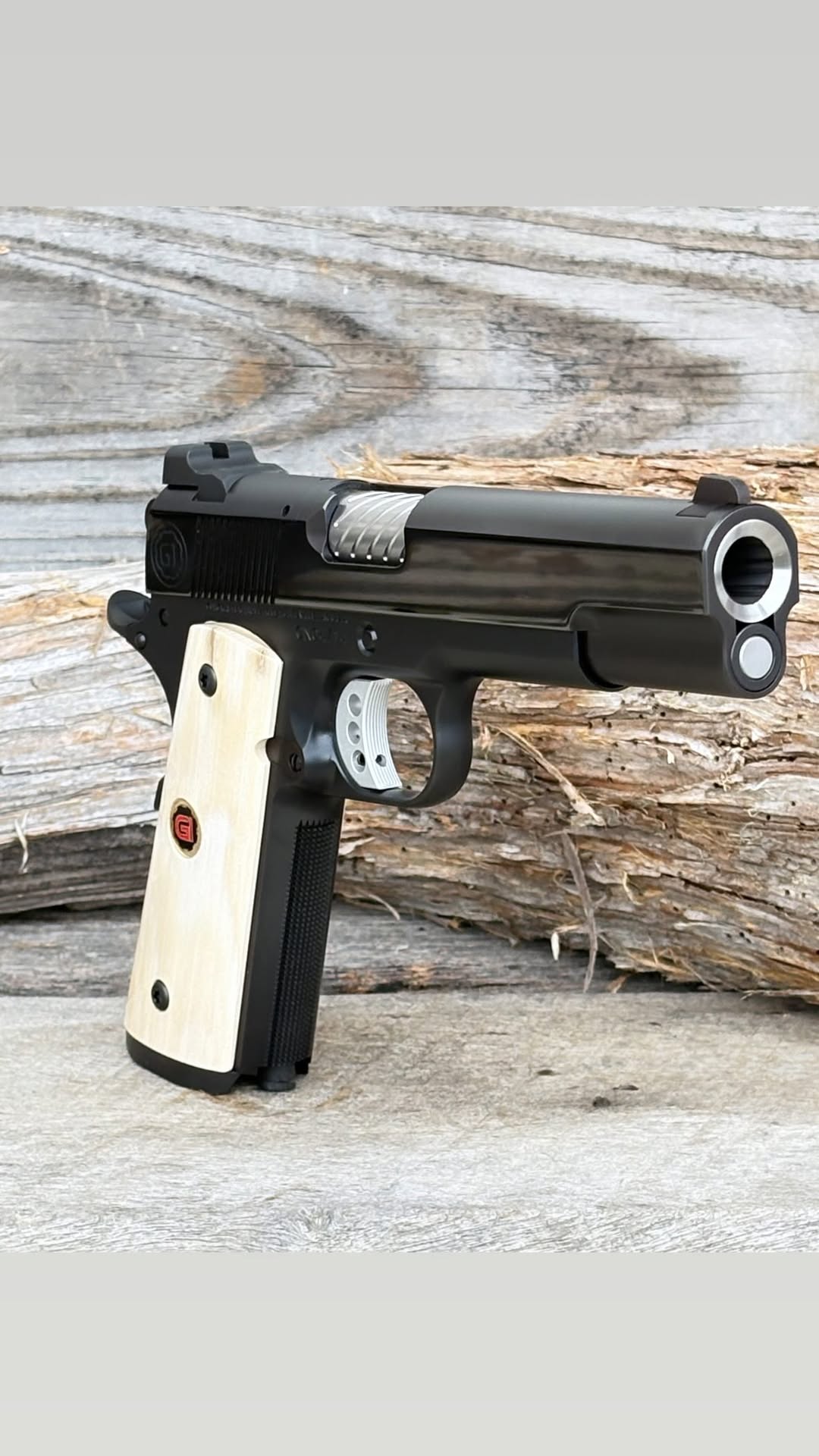 The model one is 5 inch 50 cal 1911, mirror polished slide, baron bluing, fluted barrel hood, IOS optic system, bull barrel, gold bead front sight, custom medallion set inserted into clear mammoth ivory, and traditional 3 hole trigger! This build came out unbelievable,