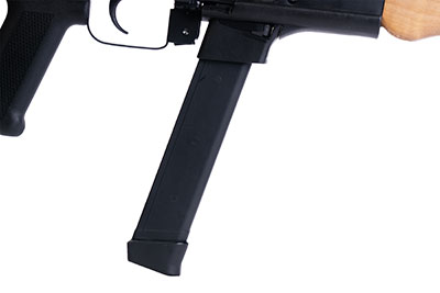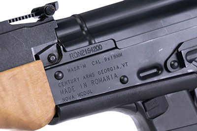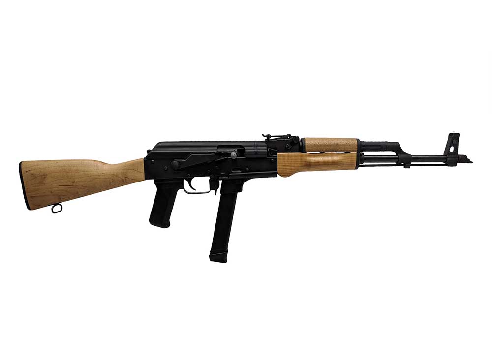 Your favorite AK rifle now available in 9mm goodness! The WASR-M is chambered in 9mm and accepts Glock-style 17 and 19 magazines, and includes a 33-round magazine. The WASR-M rifle sports a barrel length of 17.5” and features a side optic mount